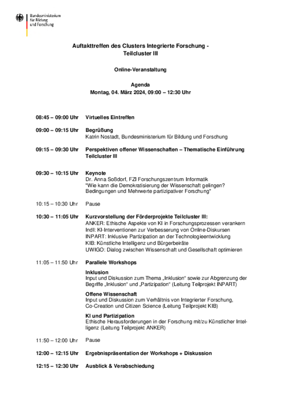 Am 04.03.2024 findet von 09:00-12:30h das Auftakttreffen des vom Bundesministerium für Bildung und Forschung geförderten Clusters Integrierte Forschung (Teilcluster III) „Perspektiven offener Wissenschaften in einer digitalisierten Demokratie“, statt. Im virtuellen Raum stellt das Teilcluster sich selbst und seine Projekte, darunter auch das KIB-Projekt des IDPFs, vor.