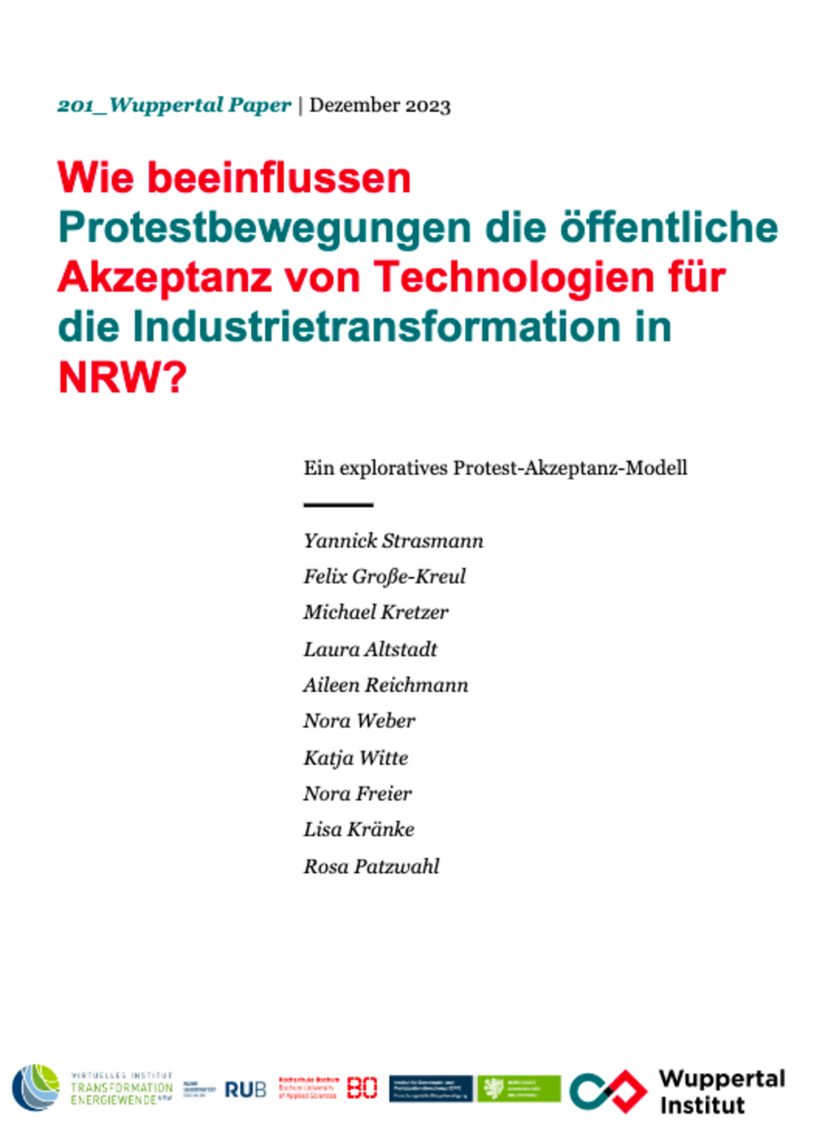 Das nun im Rahmen von Protanz.NRW veröffentlichte Wuppertal Paper "Wie beeinflussen Protestbewegungen die öffentliche Akzeptanz von Technologien für die Industrietransformation in NRW? Ein exploratives Protest-Akzeptanz-Modell" beleuchtet darüber hinaus die Zusammenhänge zwischen Protestbewegungen und öffentlicher Akzeptanz für Technologien der Industrietransformation. Dabei gingen die Forschenden folgenden Fragen auf den Grund: Inwiefern wirken unterschiedliche Protestbewegungen auf die öffentliche Meinung ein? Werden die Bewegungen die Akzeptanz der Industrietransformation eher erhöhen und die Transformation damit beschleunigen? Oder verringern Protestbewegungen die Akzeptanz in der breiten Öffentlichkeit und verhindern damit beispielsweise die lokale Umsetzung neuer Infrastrukturen oder bremsen sie aus?